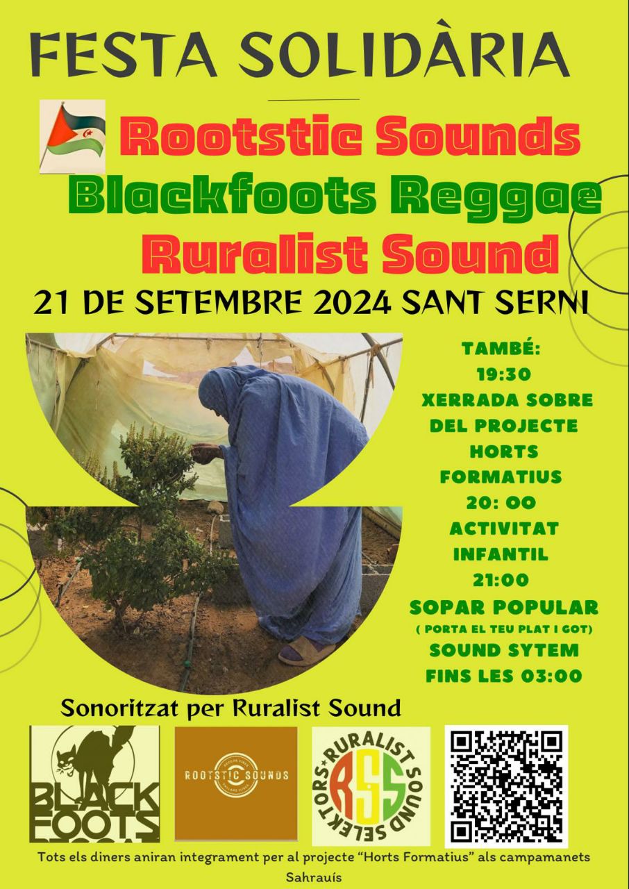 19:30h Xerrada sobre el projecte Horts Formatius 20:00h Activitat infantil 21:00h Sopar Popular (porta el teu plat i got) Fins les 3:00h Sound System Rootstic Sounds Blackfoots Reggae Ruralist Sound