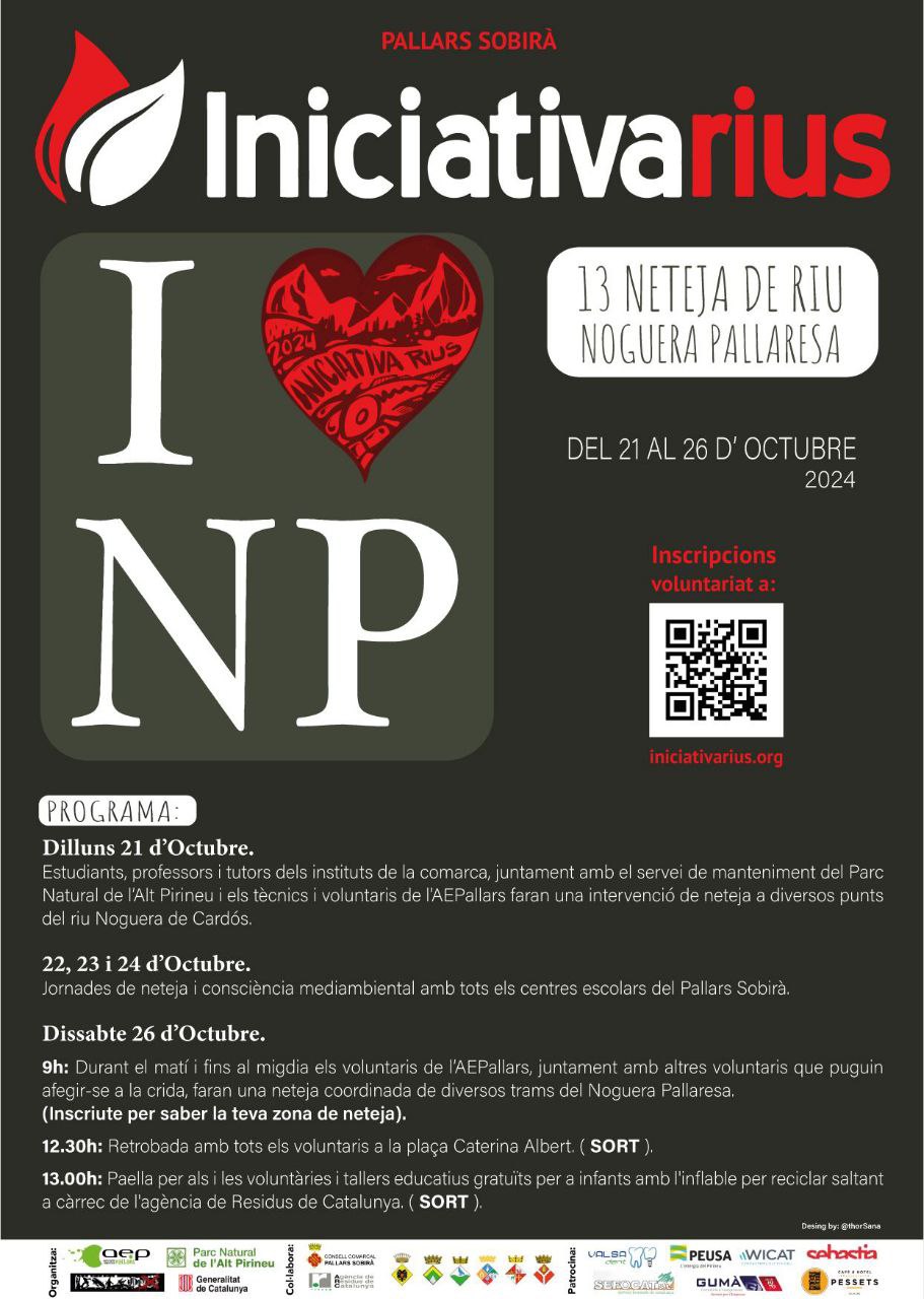 9h: Durant el matà i fins al migdia els voluntaris de l'AEPallars, juntament amb altres voluntaris que puguin afegir-se a la crida, faran una neteja coordinada de diversos trams del Noguera Pallaresa, (Inscriu-te per saber la teva zona de neteja).