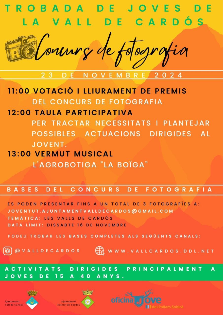 11:00h - Votació i lliurament de premis del concurs de fotografia 12:00h - Taula participativa per tractar necessitats i plantejar possibles actuacions dirigides al jovent. 13:00h - Vermut musical a l'agrobotiga "la boïga"