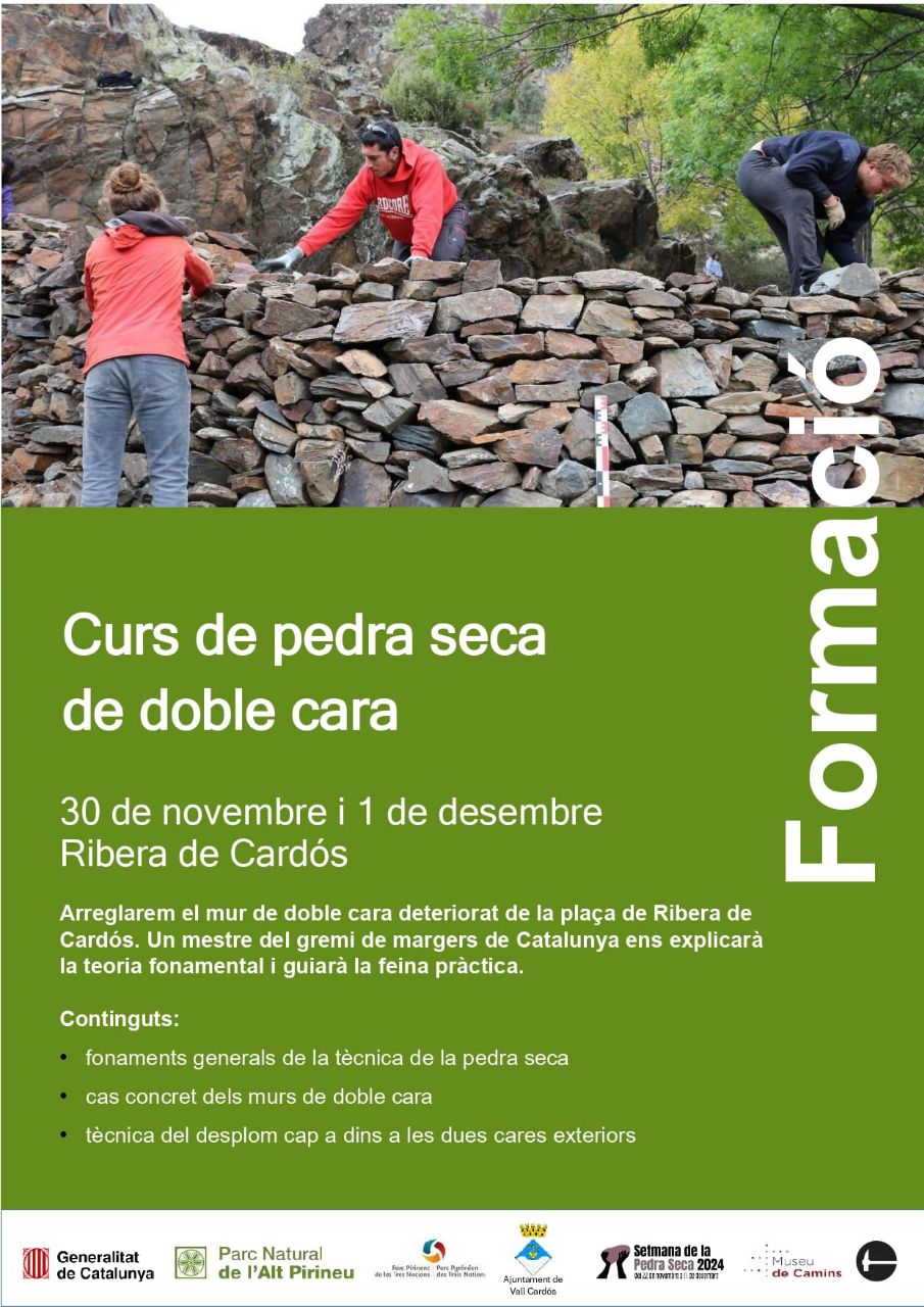 Arreglarem el mur de doble cara deteriorat de la plaça de Ribera de Cardós. Un mestre del gremi de margers de Catalunya ens explicarà la teoria fonamental i guiarà la feina pràctica.