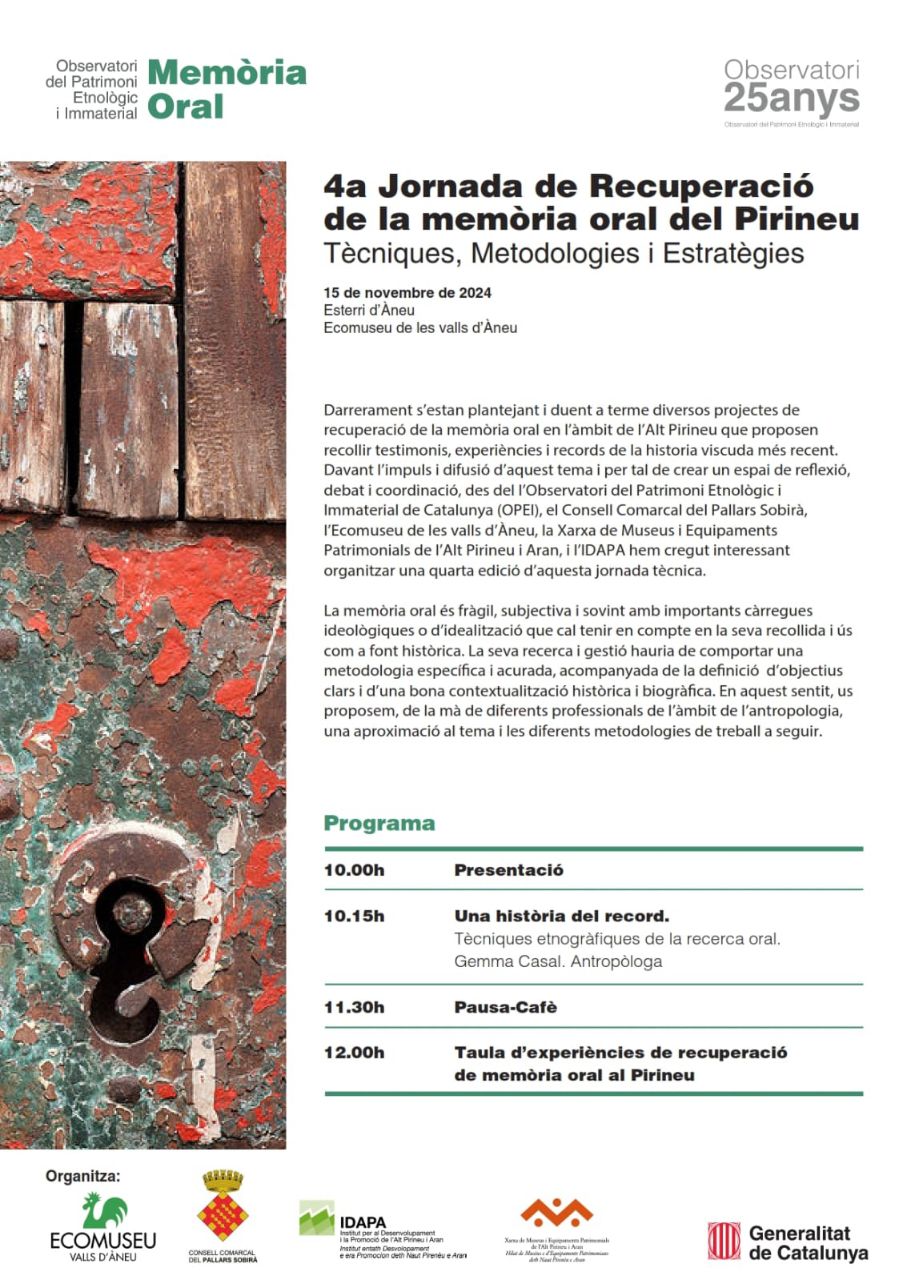 Davant l'impuls i difusió d'aquest tema i per tal de crear un espai de reflexió, debat i coordinació, des del l'Observatori del Patrimoni Etnològic i Immaterial de Catalunya (OPEI), el Consell Comarcal del Pallars Sobirà, l'Ecomuseu de les valls d'Àneu, la Xarxa de Museus i Equipaments Patrimonials de l'Alt Pirineu i Aran, i l'IDAPA hem cregut interessant organitzar una quarta edició d'aquesta jornada tècnica.