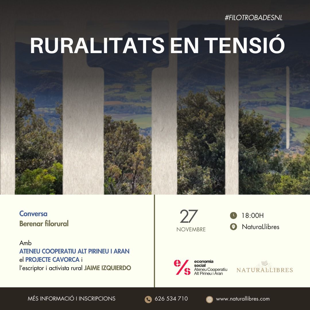 Més informació i inscripcions: https://naturallibres.com/event/filotrobadesnl-ruralitats-en-tensio-amb-lateneu-cooperatiu-de-lalt-pirineu-i-aran-i-amb-lactivista-jaime-izquierdo/