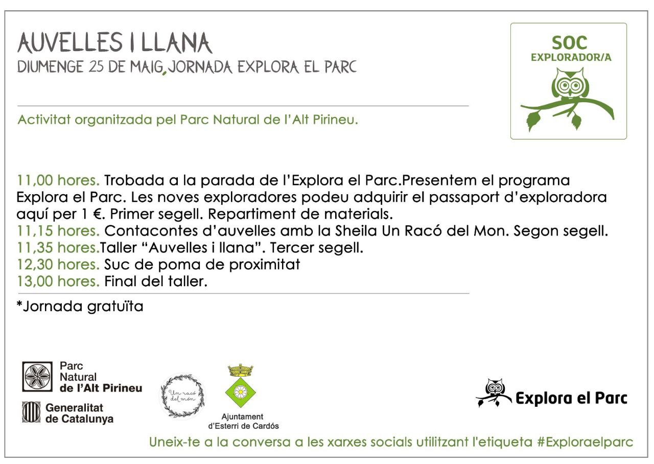 11:00h - Trobada a la parada de l'Explora el Parc. Presentem el programa Explora el Parc. Les noves exploradores podeu adquirir el passaport d'exploradora aquí per 1 €. Primer segell. Repartiment de materials.