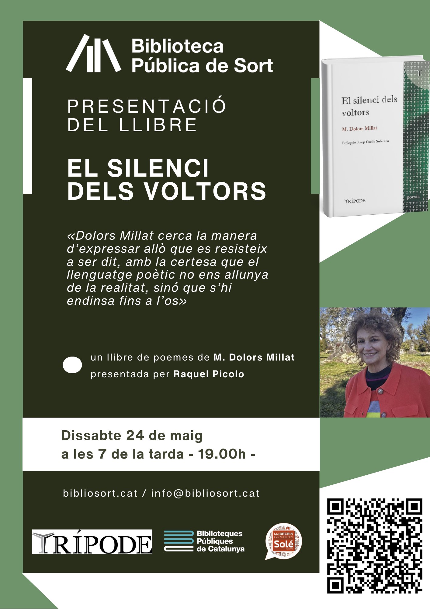 "El silenci dels voltors" és el nou poemari de M. Dolors Millat després de "Lunas de arena" i "Al batec de la terra", també disponibles a la Biblioteca Pública de Sort, i ens mostra una escriptora convençuda que el llenguatge poètic no ens allunya de la realitat, sinó que s'hi endinsa fins a l'os, en un llibre que parla de pandèmies i distopies tot interpel·lant la nostra consciència.