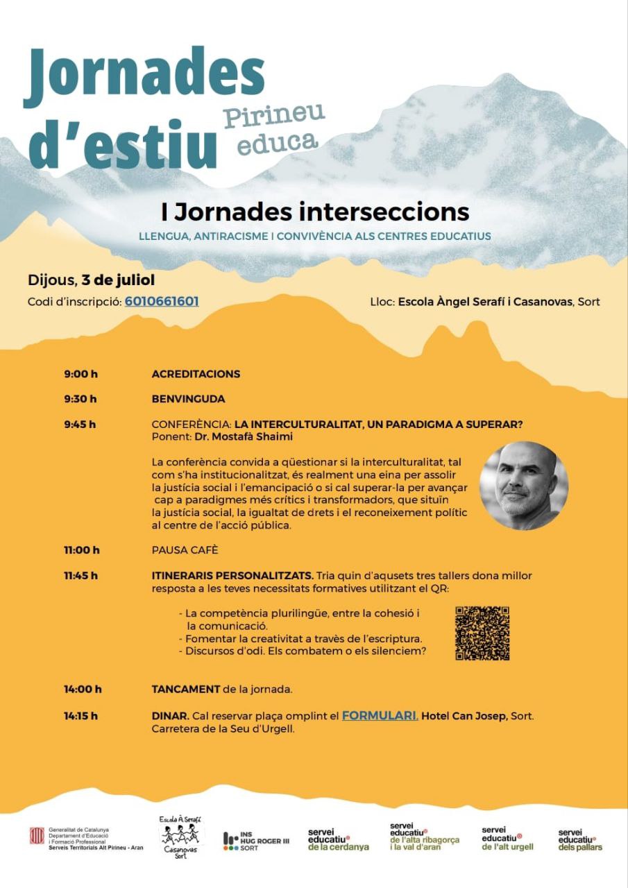 Aquesta és una activitat per a personal docent, però la conferència La interculturalitat, un paradigma a superar? del Dr. Mostafà Shaimi està oberta presencialment a tota la població. Serà el 3 de juliol a les 9.30h a l'Escola Àngel Serafí Casanovas de Sort (Sala d'actes).