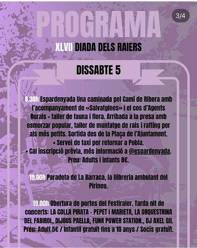 - 8:30h Espardenyada Una caminada pel Camí de Ribera amb l'acompanyament de Salvatgines i el cos d'Agents Rurals : taller de fauna i flora. Arribada a la presa amb esmorzar popular, taller de muntatge de rais i rafting per als més petits. Sortida des de la Plaça de l'Ajuntament. Servei de taxi per retornar a Pobla. Cal inscripció prèvia, més informació a @espardenyada. Preu: Adults i infants 8€.