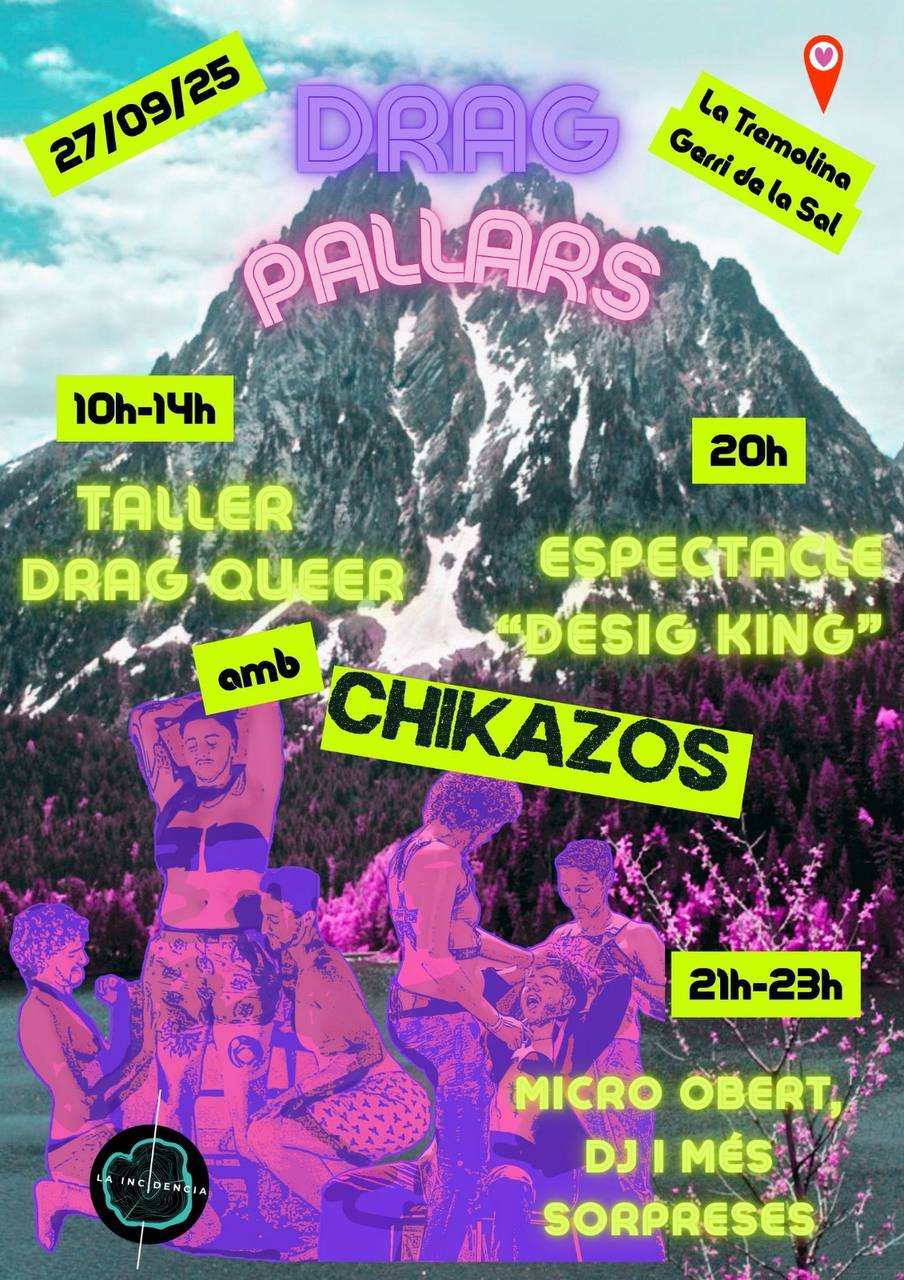 Des de la nova associació La Incidència vam preparar una jornada de presentació al Pallars, el 27 de setembre, en col·laboració amb la Tremolina i el col·lectiu de Drag Kings Chikazos! Farem un taller al matí de 10h a 14h amb pausa, serà dut a terme pels Chikazos!