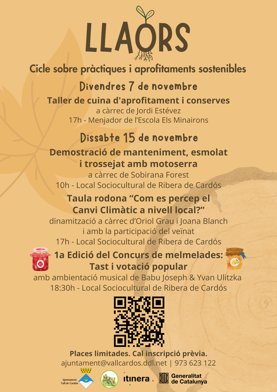 Cal inscripció prèvia a tots els tallers, i ho podeu fer contestant el formulari següent: https://forms.gle/xg28eaPb3E1eK81u8 o a través de l’Ajuntament de Vall de Cardós: enviant un correu o trucant per reservar la vostra plaça (nom i taller que us voleu inscriure): ajuntament@vallcardos.ddl.net o 973 623 122