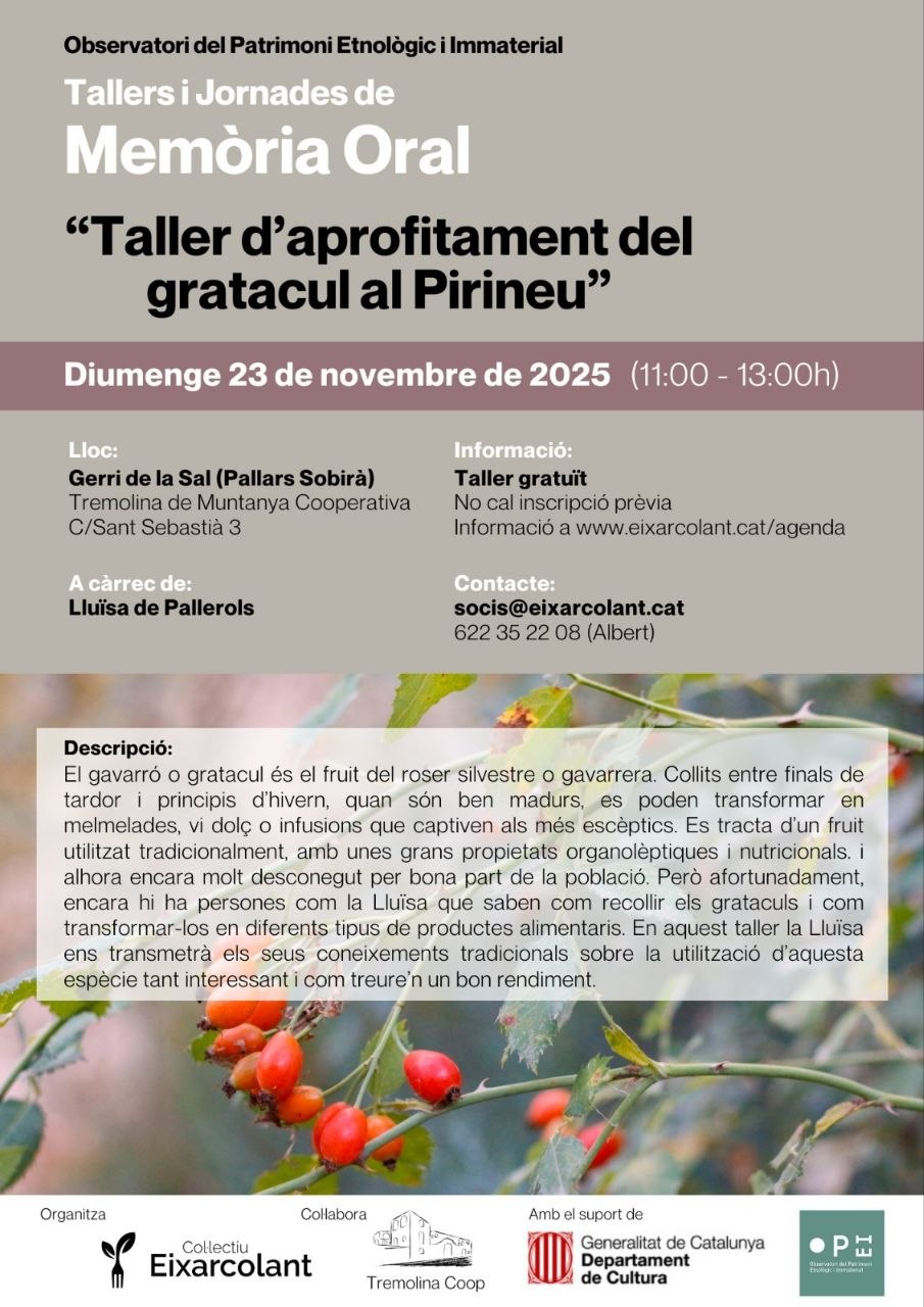 El gavarró o gratacul és el fruit del roser Silvestre o gavarrera. Collits entre finals de tardor i principis d'hivern, quan són ben madurs, es poden transformar en melmelades, vi dolç o infusions que captiven als més escèptics. Es tracta d'un fruit utilitzat tradicionalment, amb unes grans propietats organolèptiques i nutricionals. i alhora encara molt desconegut per bona part de la població. Però afortunadament, encara hi ha persones com la Lluïsa que saben com recollir els grataculs i com transformar-los en diferents tipus de productes alimentaris. En aquest taller la Lluïsa ens transmetrà els seus coneixements tradicionals sobre la utilització d'aquesta